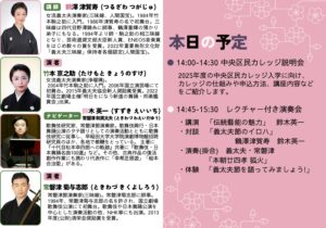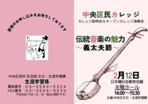 「中央区民カレッジ」 に出演します その他の公演 2025.02.052025.05.11 2025年2月12日日本橋社会教育会館(人形町)「中央区民カレッジ」 に出演します。 『本朝廿四孝』(狐火) を、義太夫と常磐津の掛合で演奏します。 〈義太夫〉浄瑠璃:竹本京之助三味線:鶴澤津賀寿〈常磐津〉浄瑠璃:常磐津和英太夫三味線:常磐津菊与志郎
